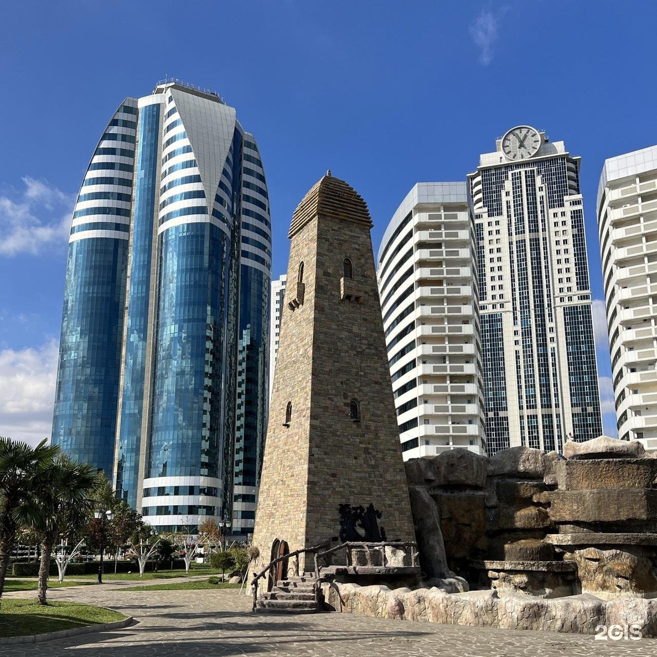 Фонтан в Цветочном парке сторожат две восемнадцатиметровые башни — современные реплики средневековых вайнахских башен (тех самых, которыми вдохновлялся архитектор будущего «Ахмат Тауэр») в натуральную величину.