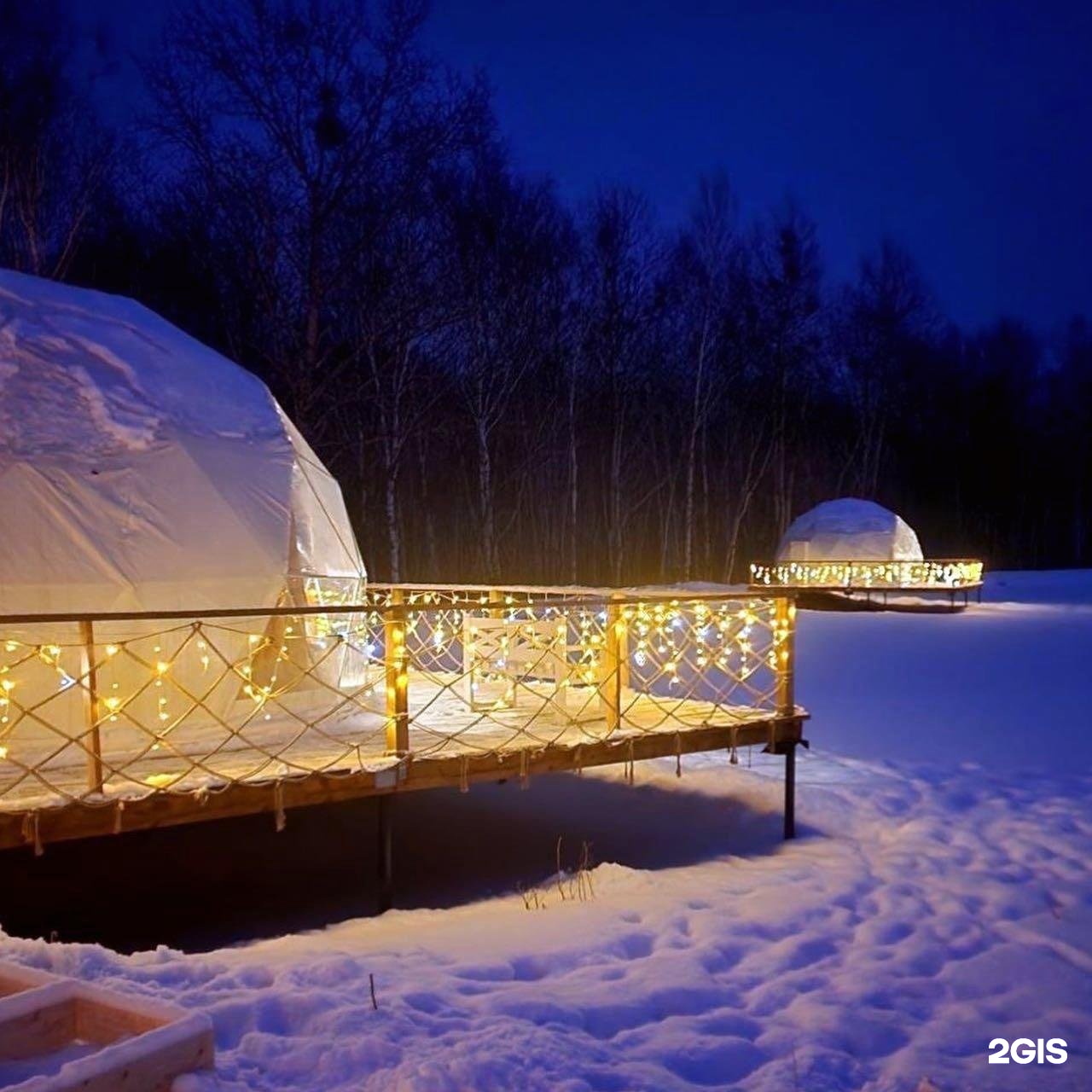 Симпатичные купольные домики с панорамными окнами у водоёма. В шале всегда тепло и уютно, поэтому морозы здесь не страшны. А ещё можно попариться в бане, а затем нырнуть в чан с горячей водой.