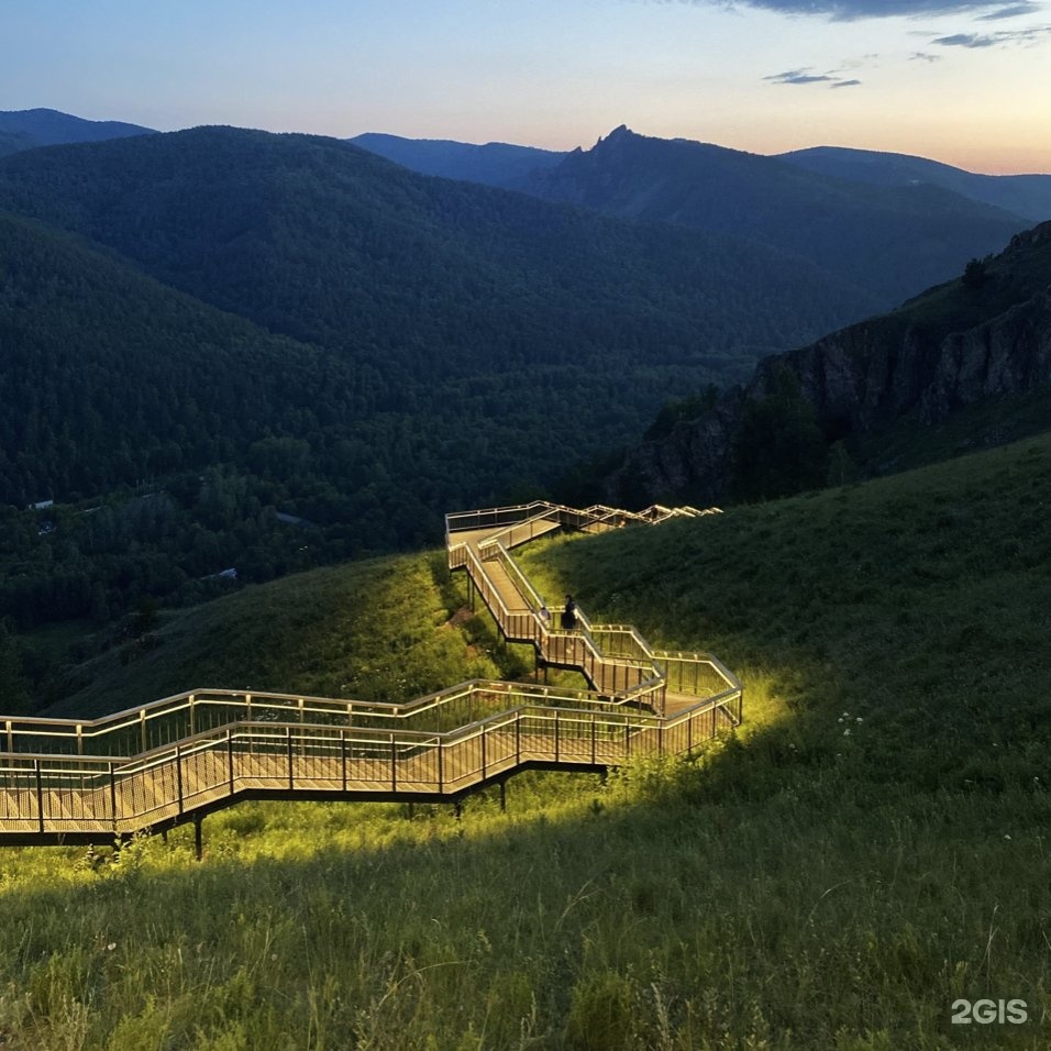 Относительно новая достопримечательность Красноярска — самая длинная лестница в России. Протяжённость лестницы на Торгашинский хребет — более километра, ступенек — более полутора тысяч, перепад высот — 240 метров. Если раньше подъём на хребет требовал некоторой физической подготовки, то теперь можно дойти за полчаса. Маршрут по лестнице начинается с территории лагеря «Гренада» (добраться до него можно автобусом или на собственном автомобиле, но имейте в виду, что парковка — крошечная). По пути — лавочки для отдыха и смотровые площадки. Вход открыт с 08:00 до 22:00. Вечером включается подсветка.