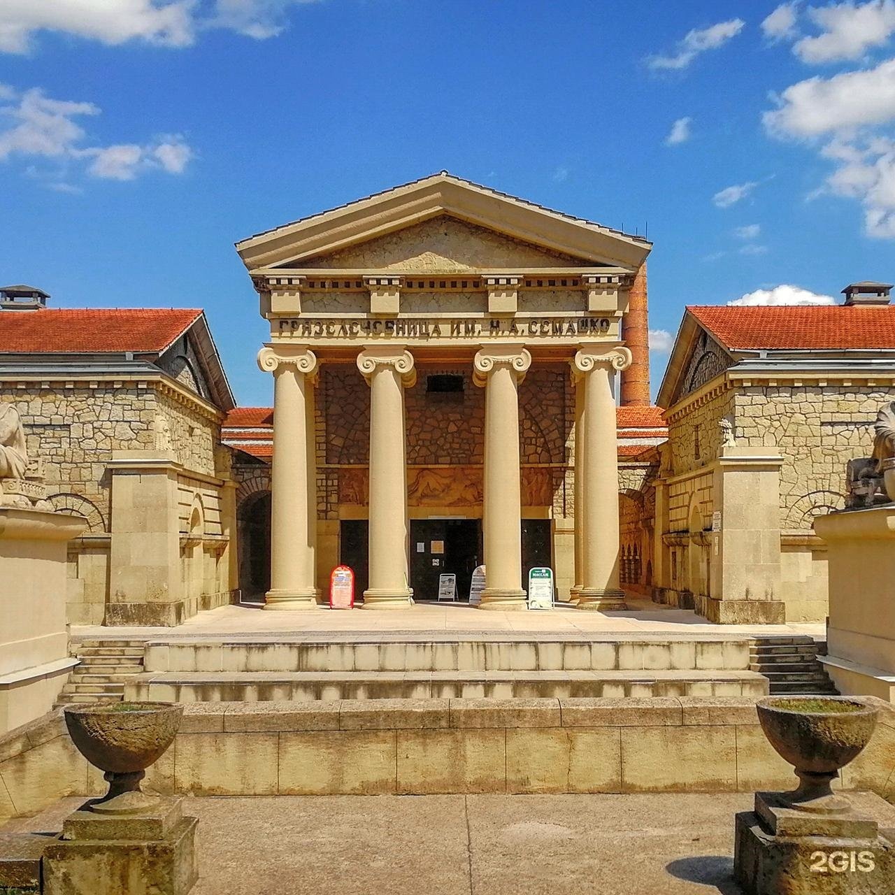 Одно из самых впечатляющих зданий в городе будто переносит в эпоху Древнего Рима. Недалеко от входа — львы, сжимающие в лапах змею-болезнь, скульптуры древнегреческих бога врачевания Асклепия и его дочери, богини чистоты и здоровья Гигеи. Внутри — тоже статуи и дубовые скамейки.