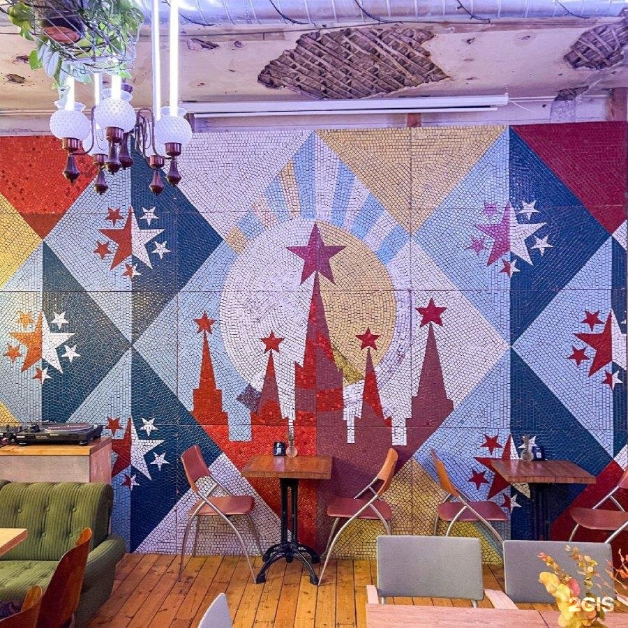 Мозаика не самый мобильный объект монументального искусства, но иногда перемещение — единственная возможность её сохранить. Сегодня в интерьерах бара «Интеллигенция» на Таганке можно увидеть панно, которое вывезли с территории завода «Серп и молот» во время сноса предприятия.