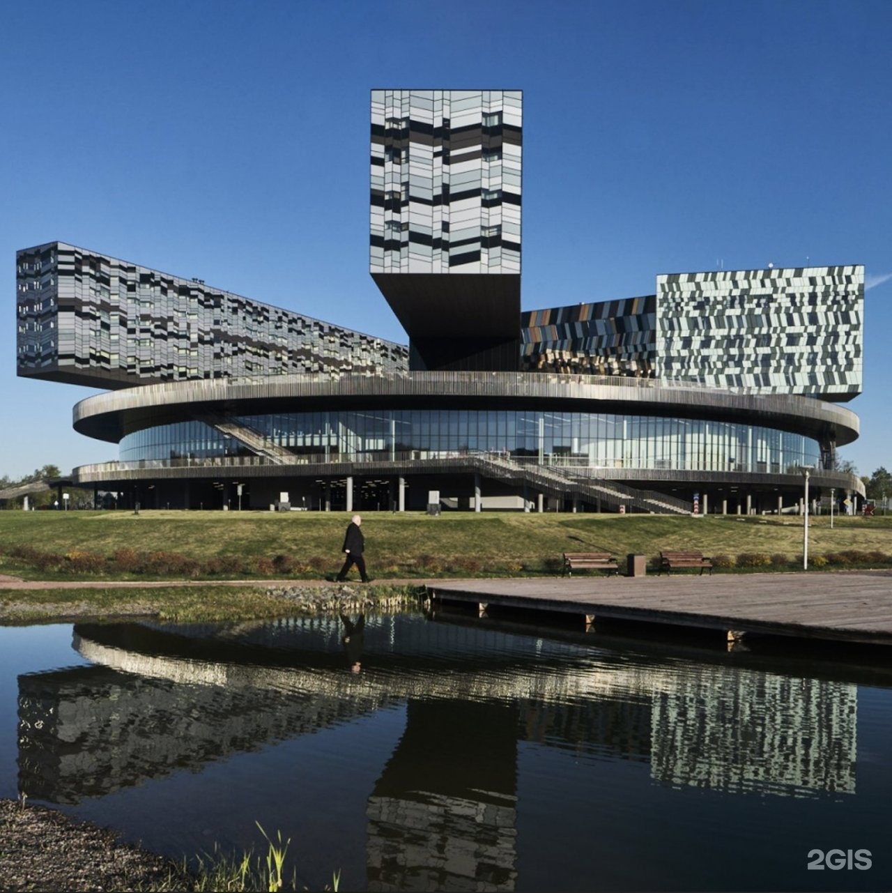 Четырехэтажный диск, лежащий в основании композиции — образовательный блок (аудитории, лектории, кабинеты), общественные пространства и фудкорт. Четыре разновеликих параллелепипеда, лежащих на этом диске, — корпуса, вмещающие административные помещения, спорткомплекс, гостиницу и общежитие.