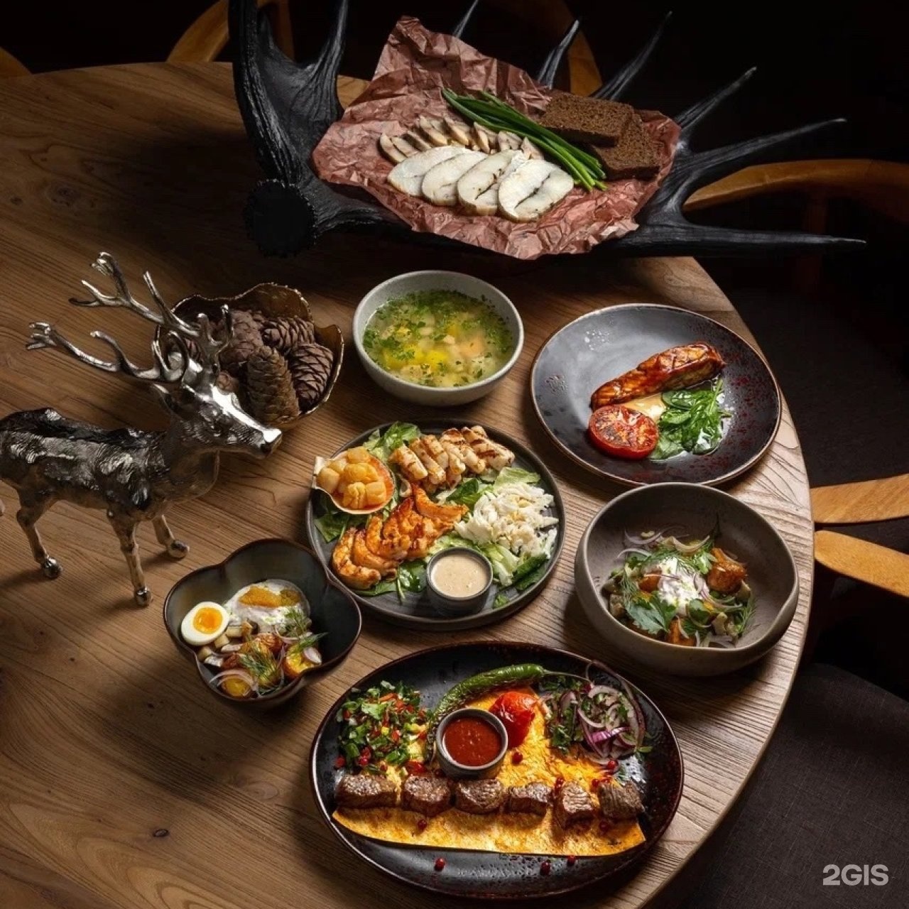 Заведение особенно гордится ухой на крабовом взваре, запечённой на берёзовых дровах камбалой, а ещё сырами из собственной сыроварни и, конечно, интерьером с отсылками к саамам и мистической стороне Кольского полуострова. Если не знаете, что выбрать, закажите дегустационный сет со всеми интересными деликатесами сразу.