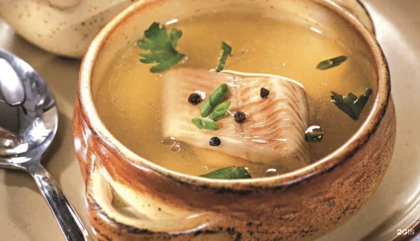 Прозрачный суп, приготовленный из стерляди, деликатесной осетровой рыбы. Фото: Гастроном