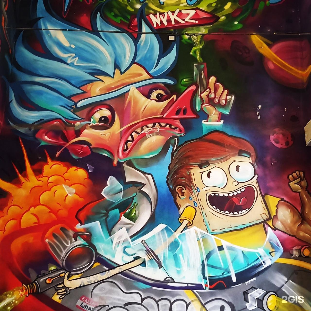 Вот, например, большое и красивое граффити, которое рисовали шесть человек, здании мастерской драмтеатра. Двухэтажная стена украшена изображением девушки в окружении кота, птицы и парочки инопланетян. Очень популярное место для фотосессий. Рядом, в районе скейт-зоны можно найти еще несколько красивых граффити.