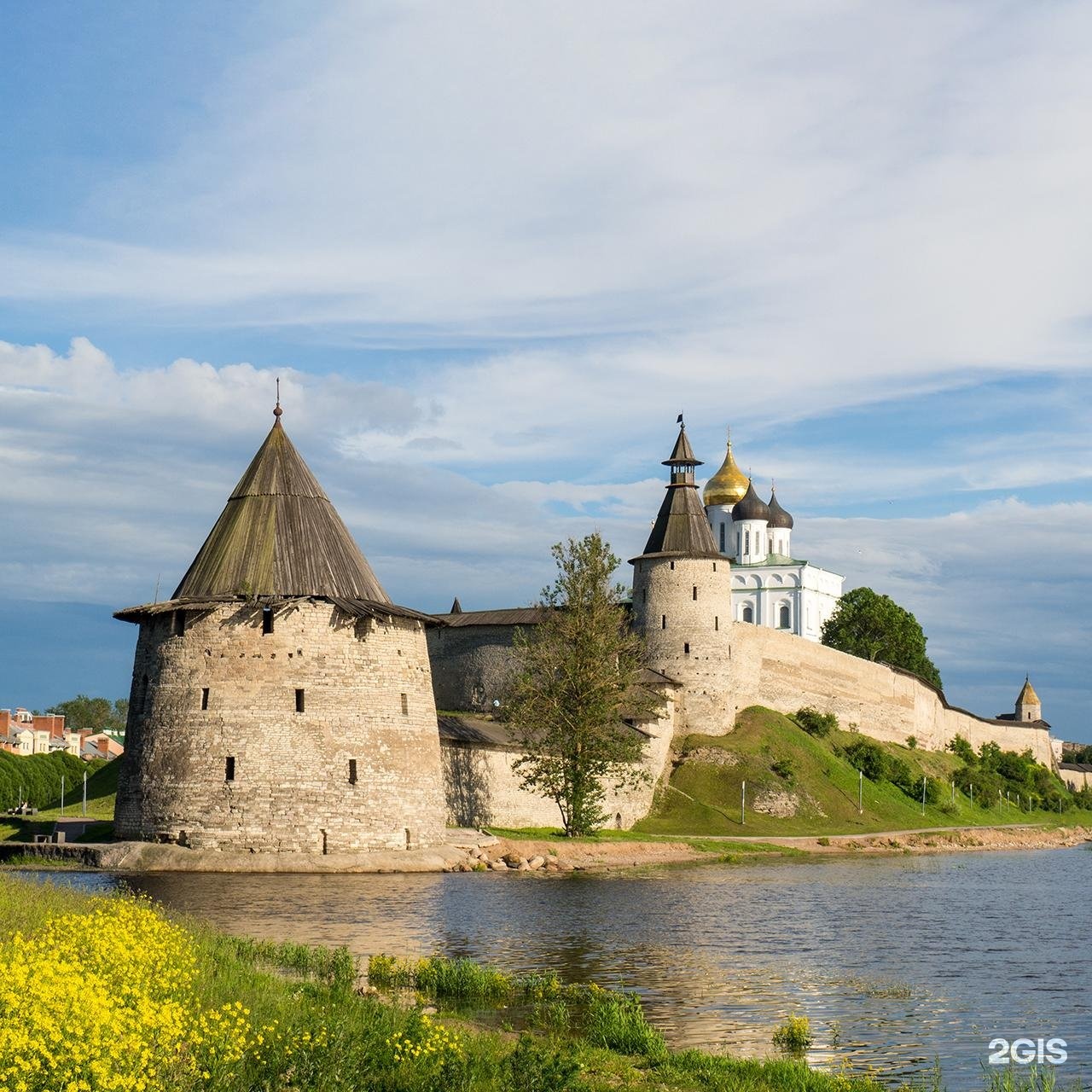 Ядро и самое защищенное место Псковской крепости — Кремль или Кром (корень — тот же, что и в словах «укромный» и «закрома»). С трёх сторон Кром окружают воды рек Великой и Псковы. Нынешние — каменные — стены построены в середине XV века при независимой Псковской республике. До этого были земляные и деревянные укрепления.