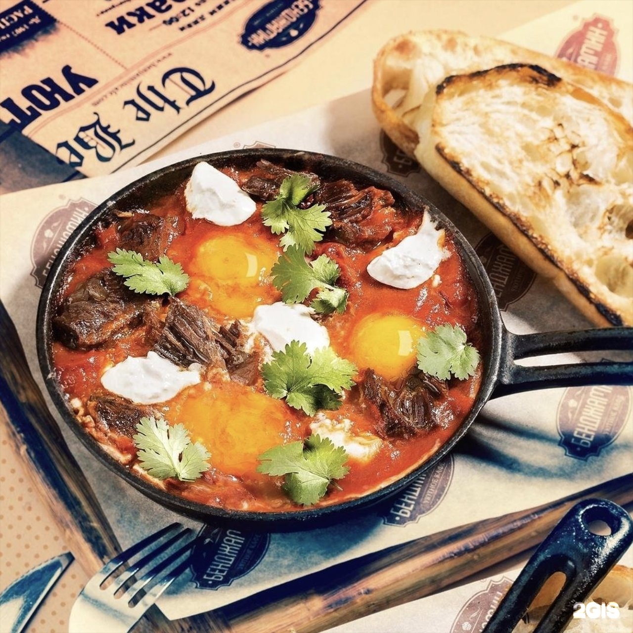 По утрам — омлеты из дровяной печи, английский завтрак с фермерскими колбасками и беконом, каши и оладьи. Меню бизнес-ланчей — большое, разнообразное и интересное. Есть бесплатная доставка от 1200 рублей.