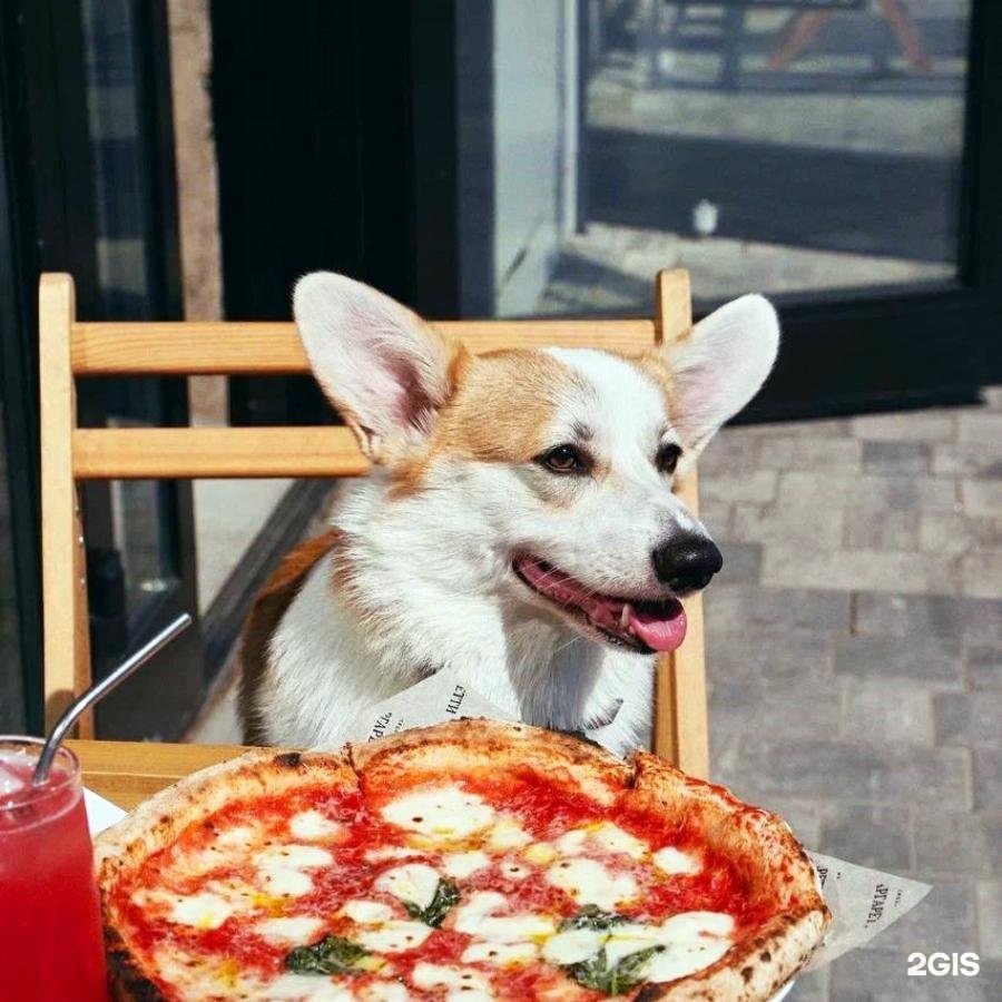 Для собак в пиццерии есть мисочки с водой и бесплатные лакомства.