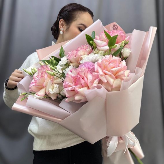 Состав: ажурные розы сорта Пинк флойд, альстромерия, хризантема, матиола, кустовая гвоздика, рускус
