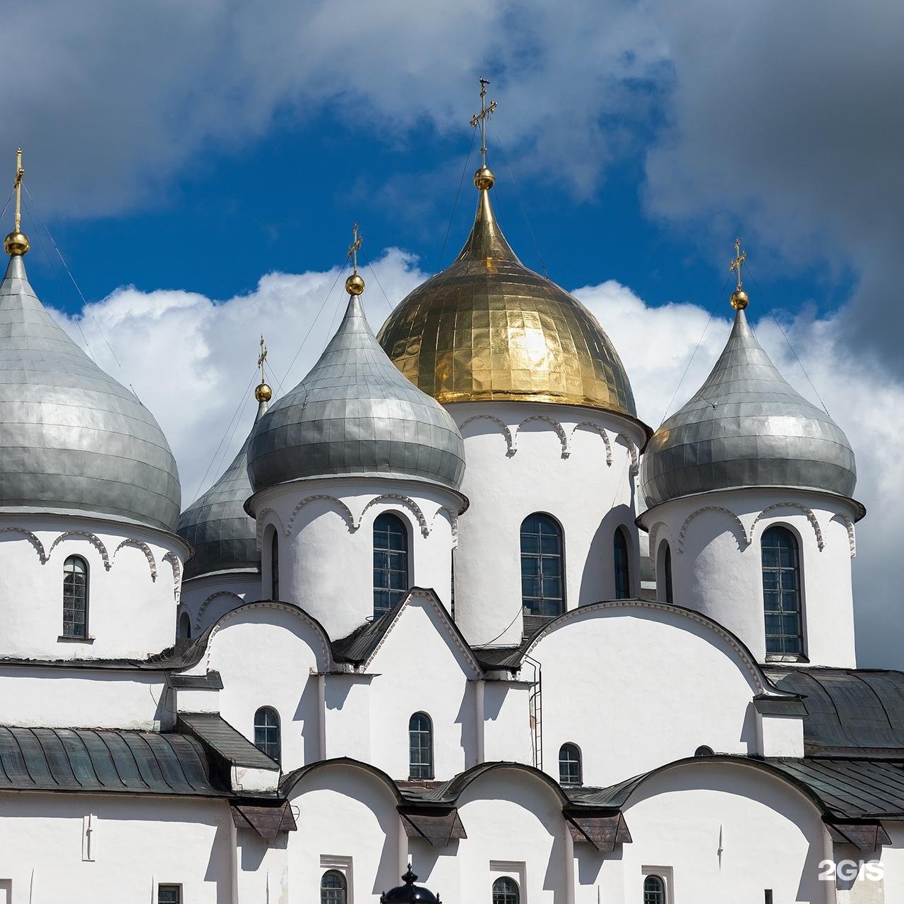 Собор Святой Софии в византийском стиле — один из древнейших храмов России (1045–1050 гг.). Первые сто лет он выглядел по-другому: небелёные стены, фрески на сводах (от них осталось немного, нынешние в основном XIX века).